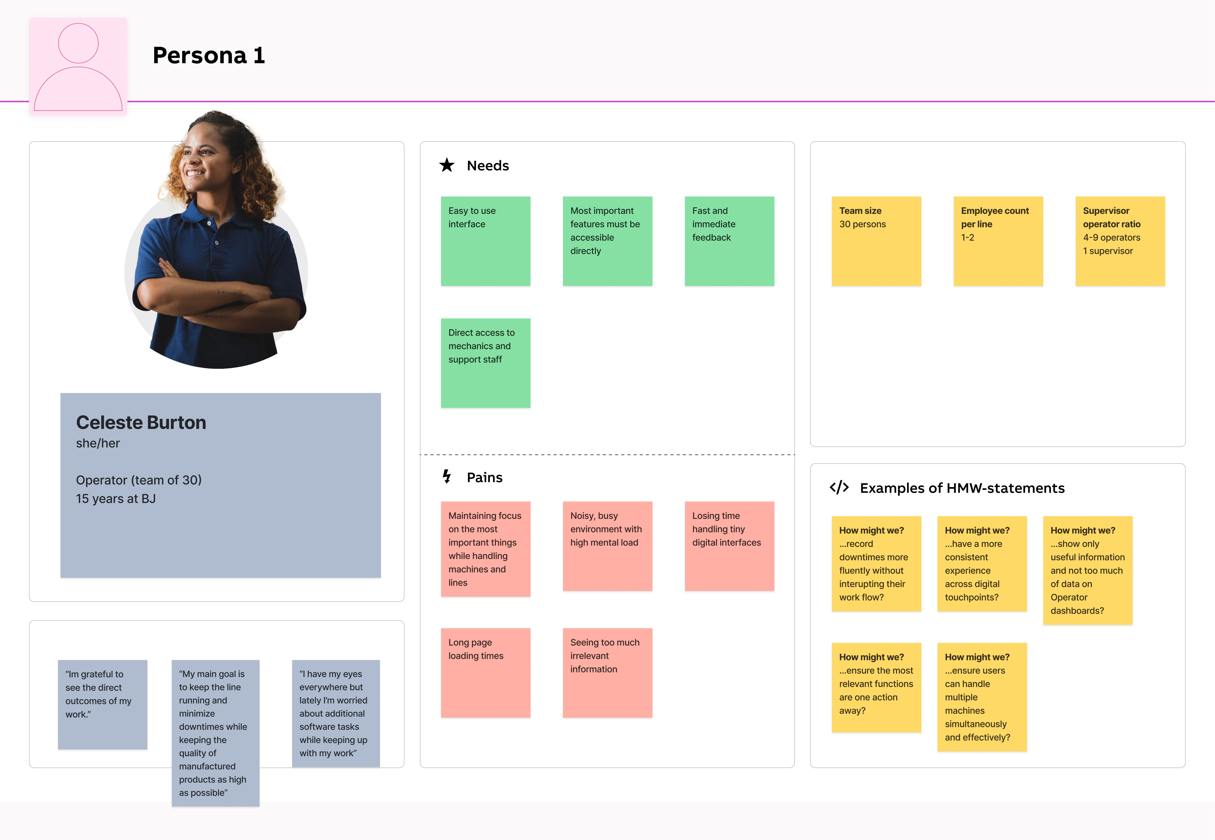 These personas were developed based on insights gathered from user interviews, video recordings, analysis of the existing application, and survey responses. Our primary persona represents an experienced plant operator with deep, hands-on knowledge of processes-someone who values speed, reliability, and minimal disruption during shift operations. In contrast, our secondary persona reflects a less-experienced team member, such as a trainee or new hire, who may lack domain knowledge but still needs to quickly understand workflows, navigate the system confidently, and complete tasks without hesitation.