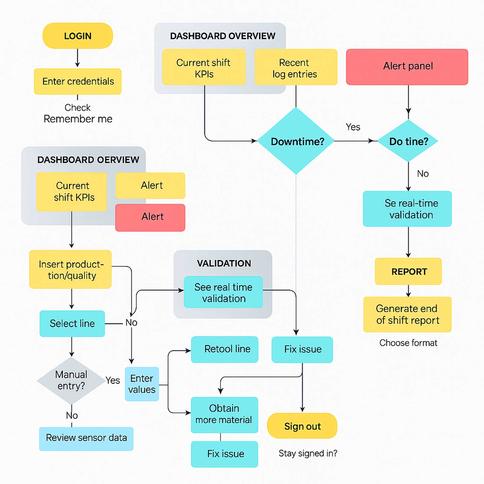 To bridge the gap between user pain points and potential design solutions, I led a series of focused brainstorming sessions with operators, supervisors, and product stakeholders. These sessions were designed to explore creative ideas around simplifying daily tasks, reducing downtime logging friction, and improving real-time visibility on the shop floor.