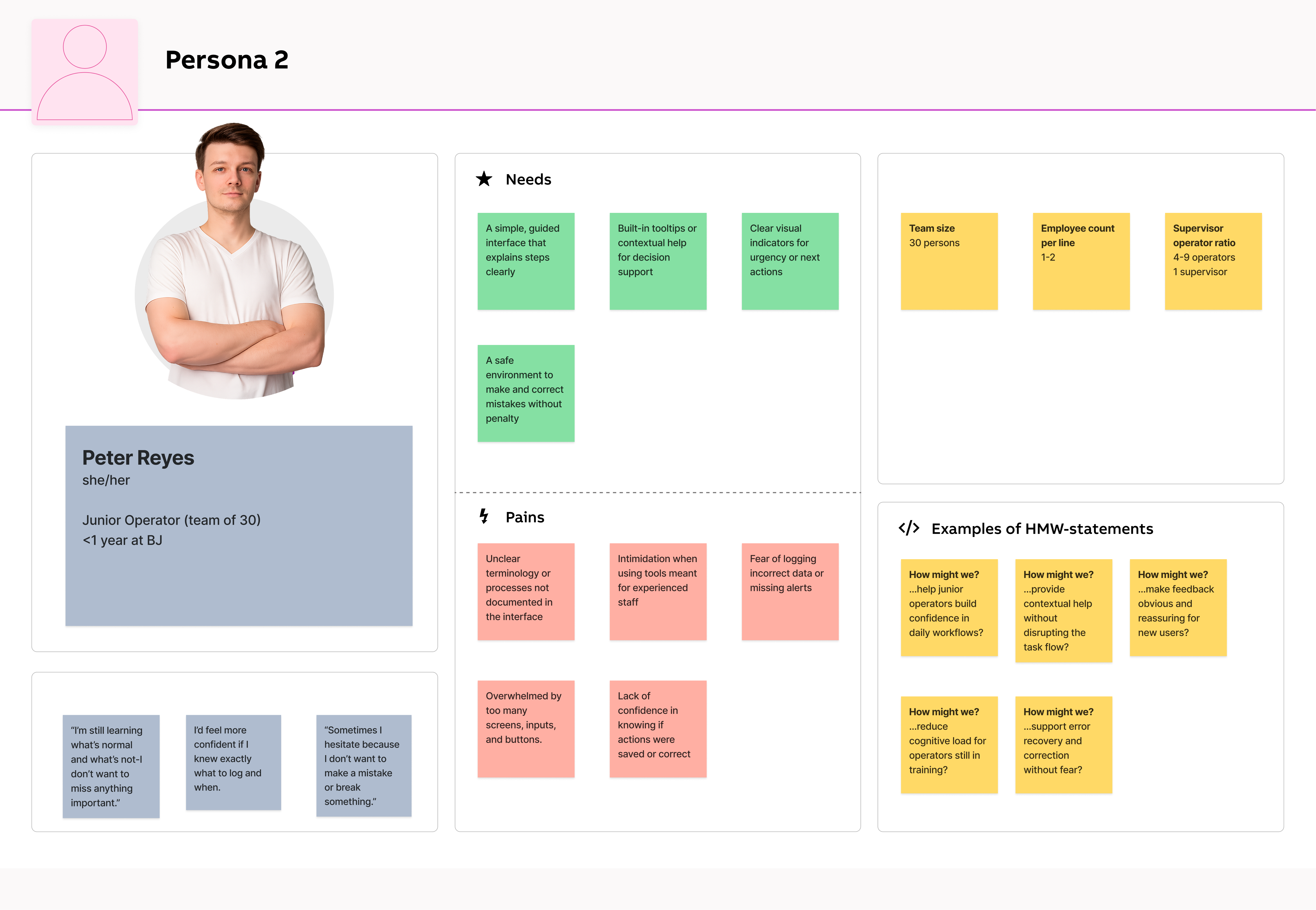 These personas were developed based on insights gathered from user interviews, video recordings, analysis of the existing application, and survey responses. Our primary persona represents an experienced plant operator with deep, hands-on knowledge of processes-someone who values speed, reliability, and minimal disruption during shift operations. In contrast, our secondary persona reflects a less-experienced team member, such as a trainee or new hire, who may lack domain knowledge but still needs to quickly understand workflows, navigate the system confidently, and complete tasks without hesitation.