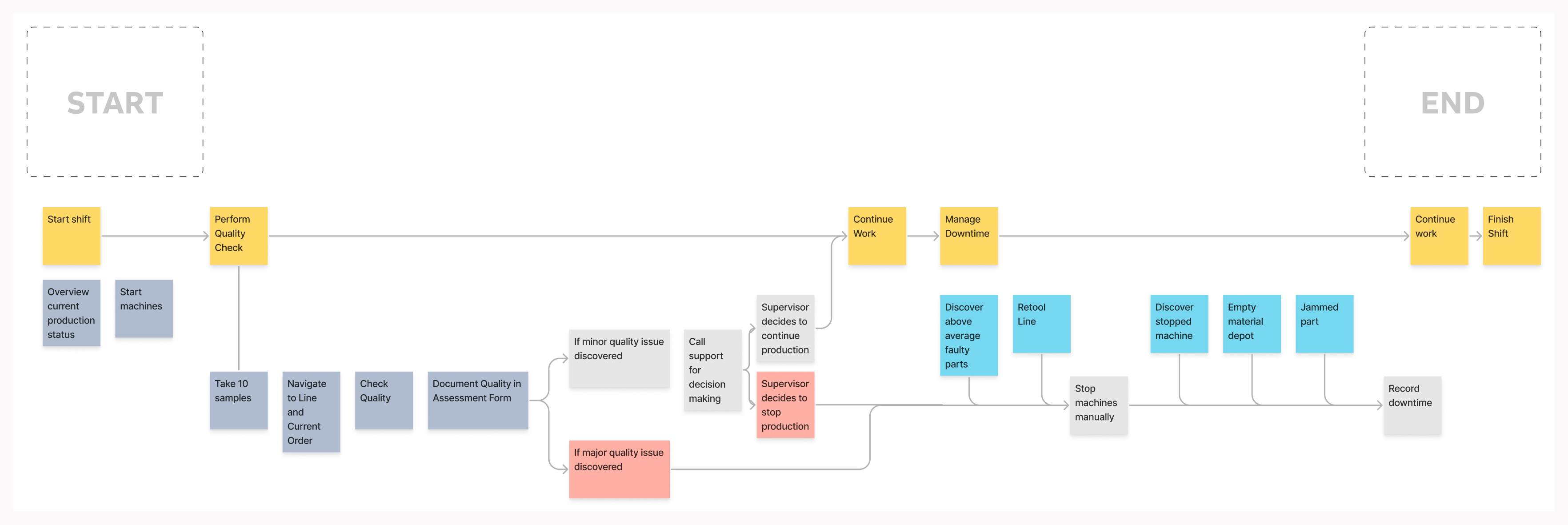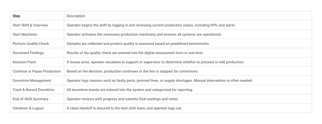 Operators begin their shift by checking production status and starting machines, then move into quality checks and logging data. If issues arise, they contact support or escalate to supervisors, sometimes halting production. Downtime events like machine faults or material shortages require manual responses and documentation. The day ends with continued production and shift handover. This fragmented, manual workflow highlights the need for a more streamlined, supportive digital system.