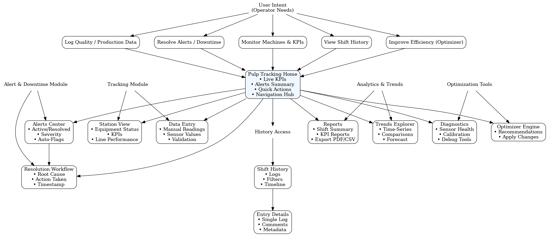 This flow captures the digital journey of an operator using the Pulp Tracking & Optimizer application. The system simplifies key shift actions, reducing manual effort, escalation delays, and fragmented tool use.